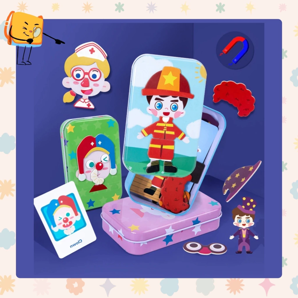 Imagine um mundo onde o rosto é de palhaço, mas o cabelo é de Mágico. Onde a roupa parece de xerife, mas o chapéu é de bombeiro. Bem-vindo ao jogo magnético "DRESS UP" Este jogo é uma explosão de diversidade e criatividade, permitindo que as crianças (e adultos também!) explorem inúmeras combinações malucas e criem seus próprios personagens únicos.